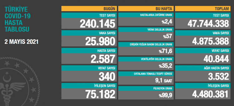 Sağlık Bakanlığı, Türkiye'nin 2 Mayıs 2021 günlük koronavirüs tablosunu açıkladı.