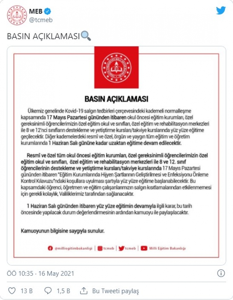 "Resmî ve özel tüm okul öncesi eğitim kurumları, özel gereksinimli öğrencilerimizin özel eğitim okul ve sınıfları, özel eğitim ve rehabilitasyon merkezleri ile 8 ve 12. sınıf öğrencilerinin destekleme ve yetiştirme kursları/takviye kurslarında 17 Mayıs Pazartesi gününden itibaren "Eğitim Kurumlarında Hijyen Şartlarının Geliştirilmesi ve Enfeksiyonu Önleme Kontrol Kılavuzu"ndaki koşullara uyulması şartıyla yüz yüze eğitime başlanabilecektir. Bu kapsamdaki öğrenci, öğretmen ve eğitim çalışanlarımızın salgın kısıtlamalarından etkilenmemesi için gerekli kolaylık, Valiliklerimiz tarafından sağlanacaktır.
