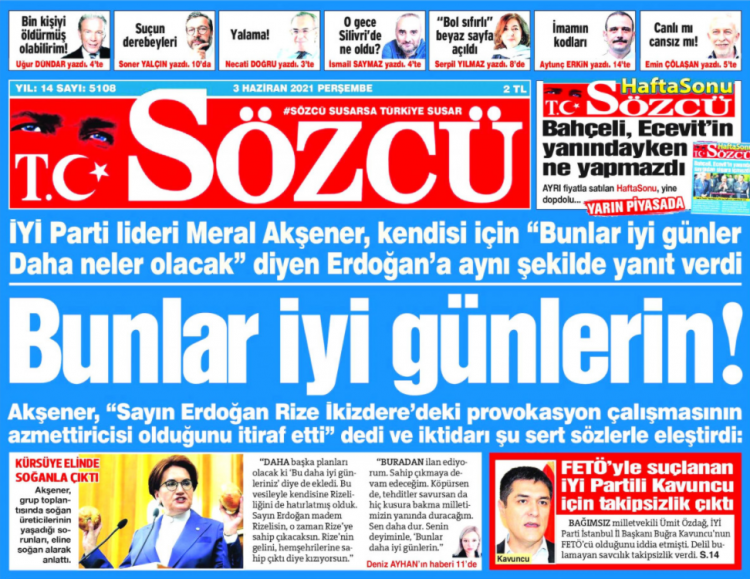 Sözcü gazetesi Cumhurbaşkanı Recep Tayyip Erdoğan'a yönelik tehdit gibi manşet attı. İYİ Parti Genel Başkanı Meral Akşener'in açıklamaları üzerinden Erdoğan'a 'Bunlar iyi günlerin' tehdidinde bulunan Sözcü'nün son günlerde iyice artan azgınlığı dikkat çekiyor.