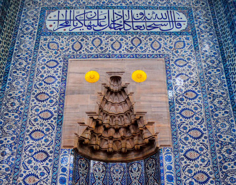 Haliç yönünden şehrin kıyı silüetinde önemli bir yere sahip olan bu cami esasen bir külliye içinde bulunur ve bu külliye Fatih ilçesinin Eminönü semtinde yer almaktadır. Rüstem Paşa Camisi, devrin sadrazamı ve Kanûnî Sultan Süleyman’ın damadı Rüstem Paşa tarafından 1555-1561 yılları arasında Mimar Sinan’a yaptırılmıştır. Cami, şehir içindeki konumu, fevkanî yapısı ve Mimar Sinan camileri içindeki yeri kadar olağan üstü çini süslemeleriyle de dünyaca ünlüdür. Caminin iç ve son cemaat yeri duvarları ile ayak, payanda, pandantif gibi öğeleri döneminin desen ve teknik açıdan en gelişmiş ve en güzel İznik çinileriyle kaplanmıştır. Yarım kubbe ve tonozların içleri sıvalı ve üzerleri kalem işi bezemelidir. Bu kısımların özgün bezemeleri 19. yüzyılda kaldırılmış, yerlerine klasik dönem üslubu ile bağdaşmayan süslemeler yapılmıştır. Son cemaat yerinde caminin ana giriş kapısının iki yanında büyük çini panolar yer alır. Bunlardan daha iyi korunmuş durumda olan soldaki pano, lâcivert zemin üzerine stilize edilmiş natüralist bir üslupla düzenlenmiş “doğa yorumu” ile klasik dönem çini süsleme sanatının en güzel örnekleri arasındadır ve bir çiçek bahçesini anımsatır. Caminin dikkat çeken bir noktası da giriş kapısında çiniyle yapılan Kabe motifidir. Kabe motifi bir kare içinde kendine özgü bir sanatla tasvir edilmiştir.