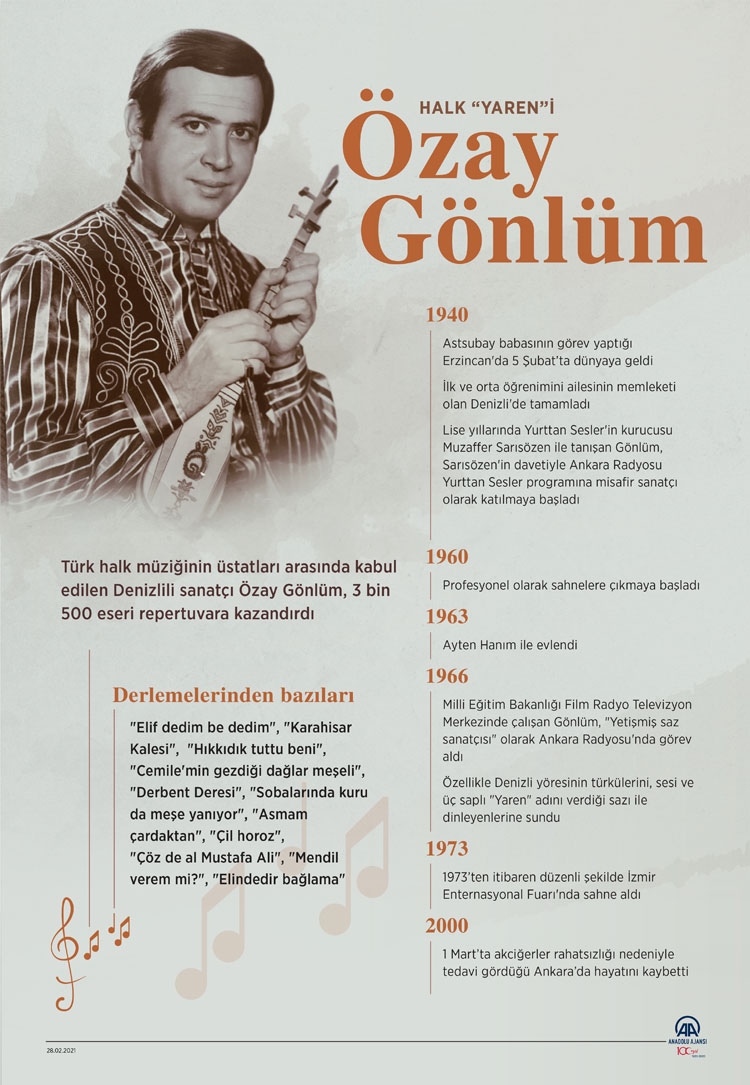 Türk halk müziğinin üstatları arasında kabul edilen Denizlili sanatçı Özay Gönlüm'ün vefatının üzerinden 21 yıl geçti.