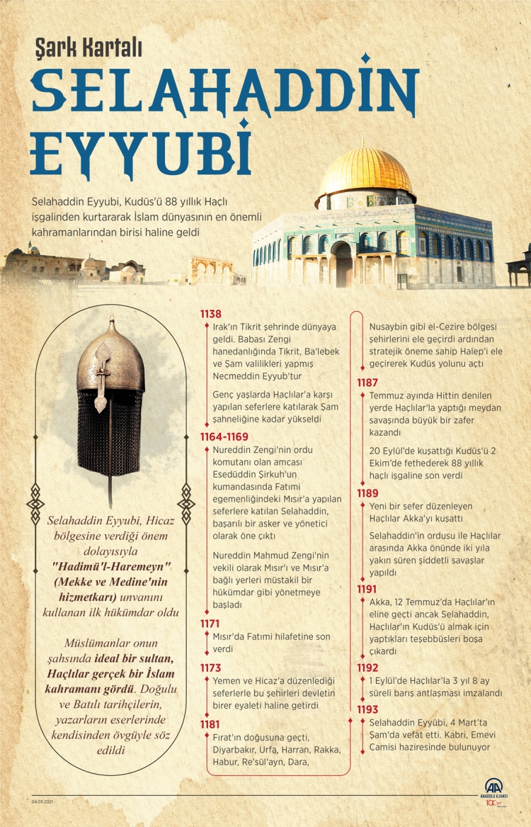 AA muhabirinin çeşitli kaynaklardan derlediği bilgilere göre, Haçlı işgali altındaki şehri işgalden kurtaracak komutan, 1138'de Irak'ın Tikrit şehrinde dünyaya geldi. Selahaddin Eyyubi’nin babası Zengi hanedanlığında Tikrit, Ba'lebek ve Şam valilikleri yapmış Necmeddin Eyyub'tur.