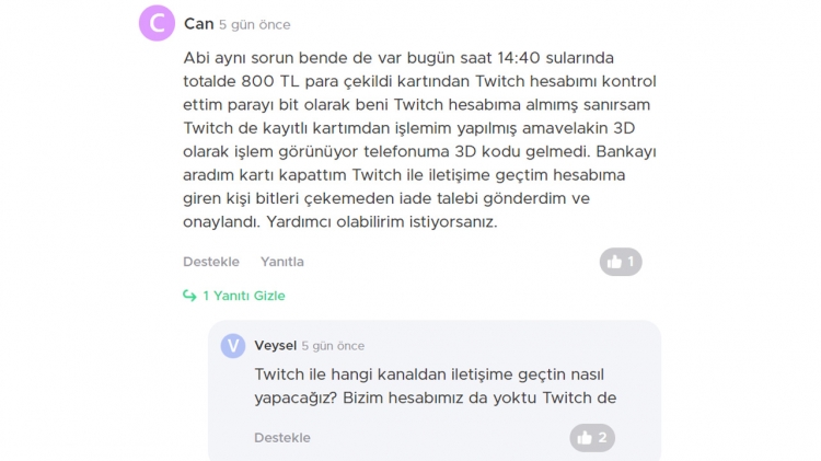 Aynı şekilde kartından izinsiz para çekildiğini ifade eden farklı bir kullanıcı, bu olayın ‘bit scam’ tarzında bir kredi kartı hırsızlığı olduğunu ve Twitch’le iletişime geçildiğinde paranın geri alınabileceğini söyledi. Bir başka kullanıcı ise yaptığı yorumda “Çok geçmiş olsun. Hiç boşuna Twitch ile iletişime geçmeye uğraşmayın. Telefon ya da internet bankacılığı aracılığıyla bankanıza başvurarak işlemin sizin tarafınızdan yapılmadığını belirterek harcama itirazı başlatın. Çok kısa sürede bankanız paranızı iade edecektir.” ifadelerini kullandı. Görünüşe bakılırsa Twitch’in itibarına ciddi zararlar veren bu sorun ve bu soruna tepki olarak başlatılan #temiztwitch etiketi bir süre daha devam edecek.