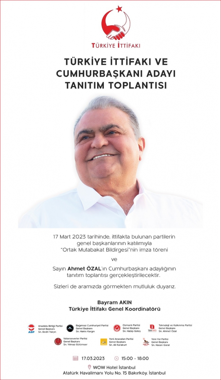 Özal'ın ittifaktaki tüm partilerden onay aldığı belirtilirken, tanıtım toplantısının yarın yapılacağı bildirildi.