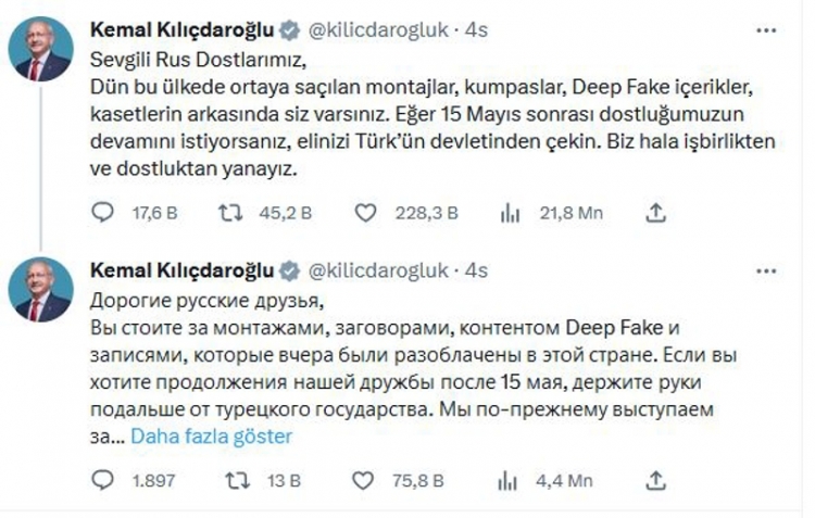 "Sevgili Rus Dostlarımız, Dün bu ülkede ortaya saçılan montajlar, kumpaslar, Deep Fake içerikler, kasetlerin arkasında siz varsınız. Eğer 15 Mayıs sonrası dostluğumuzun devamını istiyorsanız, elinizi Türk'ün devletinden çekin. Biz hala iş birlikten ve dostluktan yanayız."