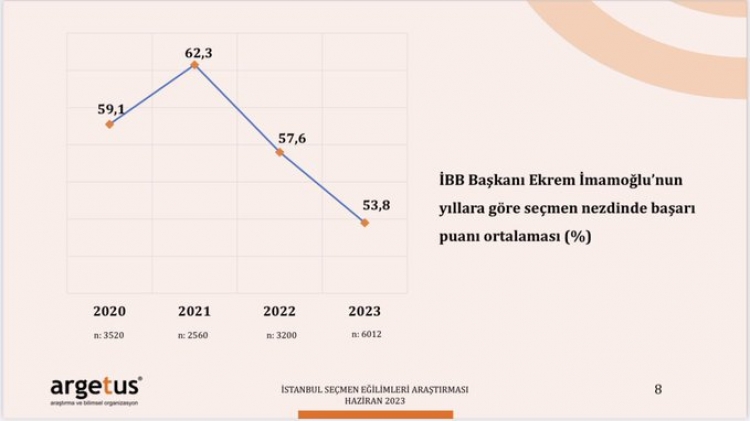 Argetus Araştırma, İBB Başkanı Ekrem İmamoğlu'nun yıllara göre seçmen nezdindeki başarı puan ortalamasını da çıkardı. 2020 yılında yüzde 59.1 olan İmamoğlu'nu başarılı bulanlar 2021'de yüzde 62.3 ile zirveyi görmüş. 2022 yılında İmamoğlu'nu başarı bulanların oranı yüzde 57.6'ya, 2023'te ise yüzde 53.8'e düşmüş.