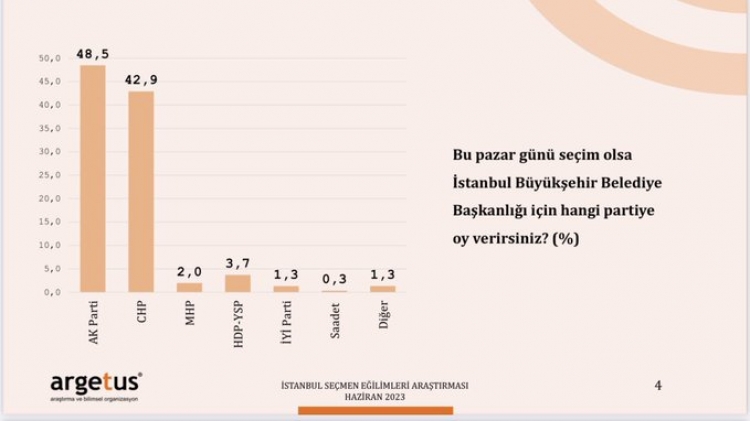 Argetus Araştırma, 1-6 Haziran tarihleri arasında İstanbul'un 39 ilçesinde 6 bin 12 kişi ile yerel seçim anketi yaptı. Argetus Araştırma'nın anketine katılanlara, "Pazar seçim olsa İstanbul Büyükşehir belediye Başkanlığı için hangi partiye oy verirsiniz" sorusu yöneltildi.