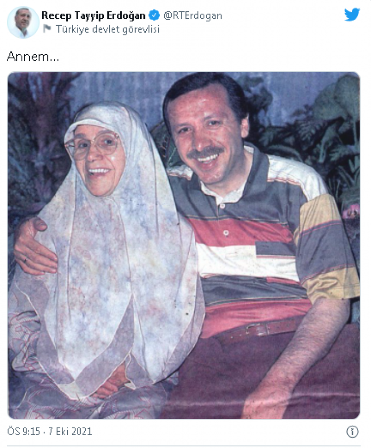 Erdoğan, sosyal medya hesaplarından annesi Tenzile Erdoğan ile çekilen bir fotoğrafını "Annem" mesajıyla paylaştı.