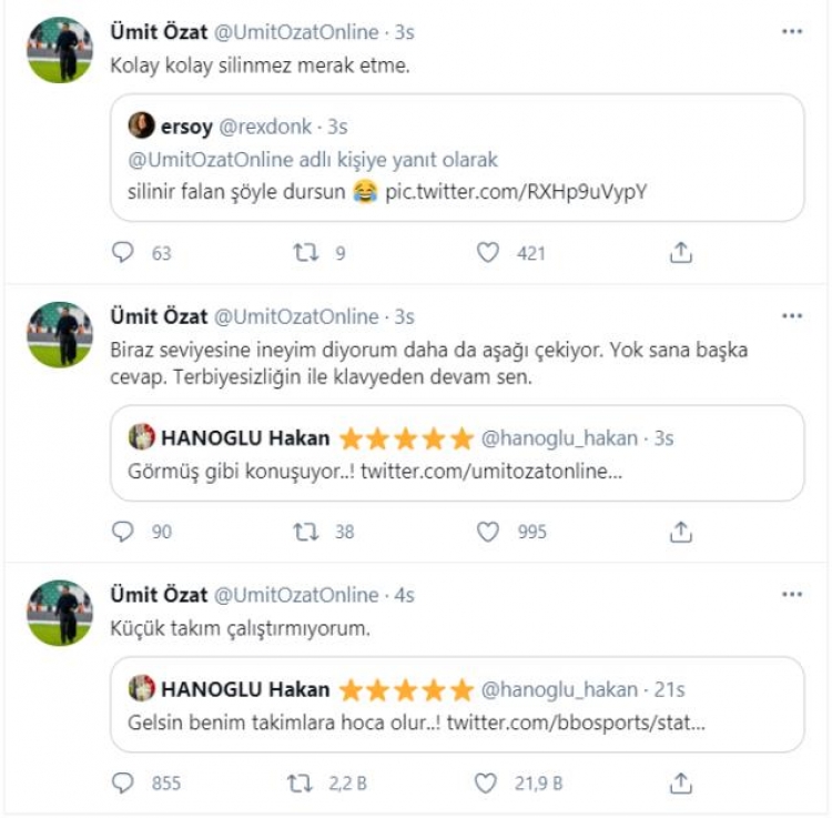 Hakan Hanoğlu da üslubunu bozarak, "Görmüş gibi konuşuyor" yanıtı verdi. Özat bunu da karşılık verdi: Biraz seviyesine ineyim diyorum ama daha da aşağı çekiyor. Yok sana başka cevap. Terbiyesizliğin ile klavyeden devam sen.