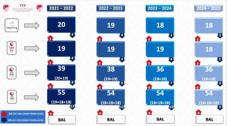 TFF'nin paylaşımına göre, önümüzdeki 3 sezonda tüm liglerde yer alacak takım sayılarının tablosu: