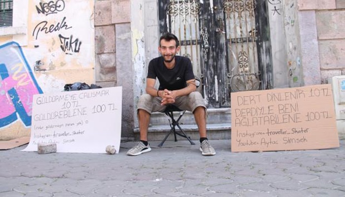Kendisini güldürmeye çalışanlardan 10 lira isteyen, güldürebilmeyi başarana ise 100 lira vereceğini kartona yazan Aytaç Şimşek, aynı yazının altına da 'Ne olur güldürmeyin, param yok' diyerek de esprili bir dille atıfta bulundu. Şimşek, "Bundaki sebep de şu aslında, insanların yüzünde bir tebessüm koymak. Gelen geçen o şeyi gördüğünde, güldürmeye çalışmak on lira, güldürebilene yüz lira. Otomatikman güler, ilk defa böyle bir şey görüyorlar çünkü. Bunu da ilk çıkaran benim. Amacım şu: İnsanların yüzünde tebessüm görebilmek. Mesela karşımızda birisi ağlıyor. Bunu gördü tebessüm etti, bir anlık derdini unuttu. İnsanlar ne kadar çok gülerse dertlerini o kadar hafifler. Bu yüzden böyle bir şey geldi aklıma. Karşılayabildiğim kadarını karşılarım. Param mı kalmadı, o zaman kartonları kapatırım, dertten devam ederim" açıklamasında bulundu.